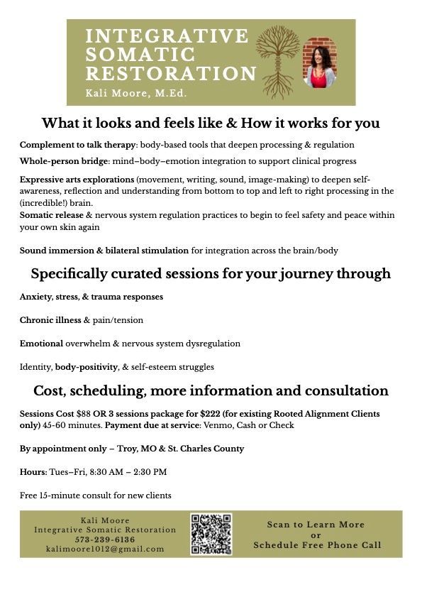 Depending on your needs, we can incorporate other integrative somatic tools that align with your needs and goals. Nurturing your mind, body, and spirit.